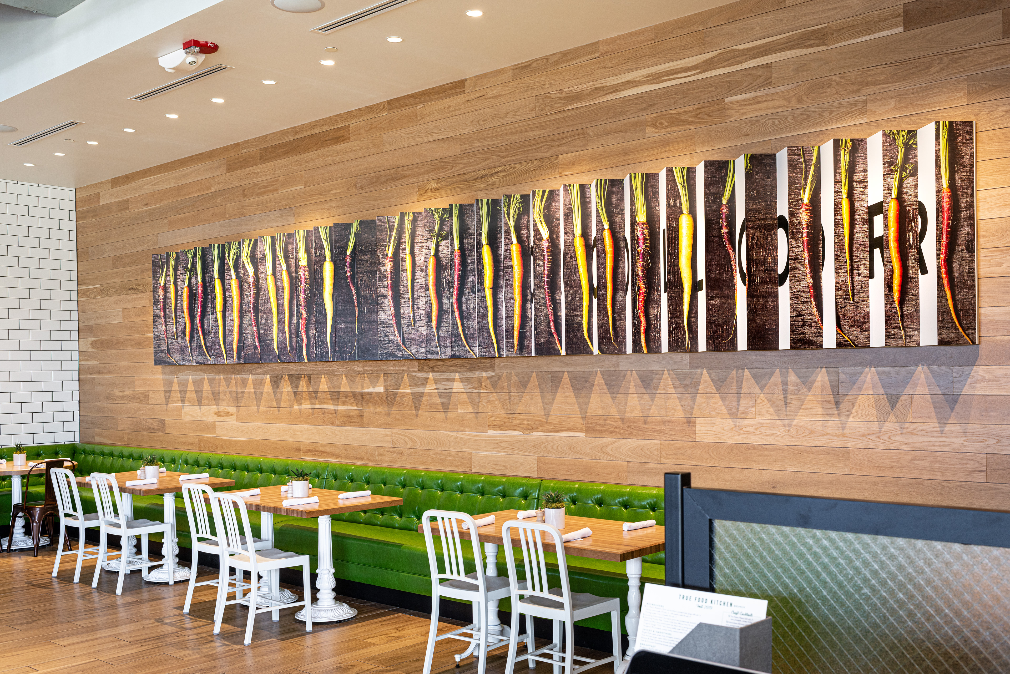 A hand drawn squash blossom mural was created to welcome you as you enter the Oakbrook, Illinois location of True Food Kitchen. Followed by bright graphics and a handmade Tree of Life installation.